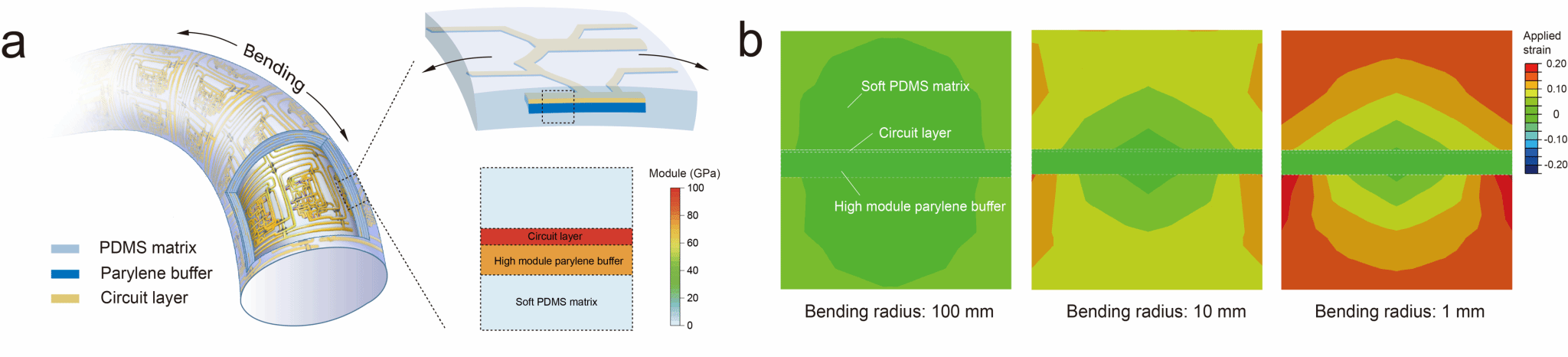 目前集成电路产业的光刻制备普遍依赖硅晶圆衬底,还很难直接在弹性高分子基底上实现高密度晶体管集成电路的光刻制造,主要面临三方面难题。首先,常用弹性高分子(如聚二甲基硅氧烷等)表面在微观尺度很不平整,粗糙度一般为几十纳米,很难满足集成电路光刻对衬底的平整度要求;其次,目前光刻过程中用到多种极性溶剂,弹性高分子与这些溶剂接触后极易发生溶胀,难以进行集成电路的稳定光刻制造;最后,集成电路中的很多功能组分,如半导体、金属导电通路等,很难承受纤维拉伸、扭曲等复杂变形中所引起的局部应变集中,极易引发电路结构脆裂和性能快速失效。