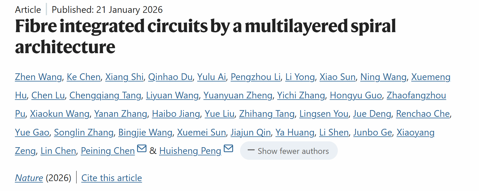 上述成果于北京时间1月22日凌晨以《基于多层旋叠架构的纤维集成电路》(“Fibre integrated circuits by multilayered spiral architecture”)为题发表于《自然》主刊(Nature)。复旦大学纤维电子材料与器件研究院、高分子科学系、先进材料实验室教授彭慧胜、陈培宁为本论文通讯作者,博士研究生王臻、陈珂和博士后施翔为共同第一作者。