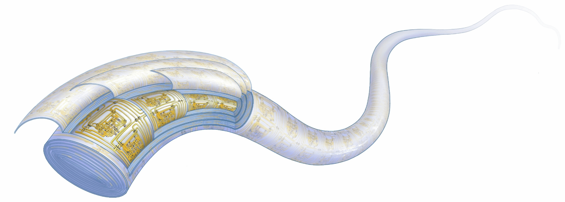 团队提出多层旋叠架构的设计思想,即在纤维内部构建多层集成电路,形成螺旋式旋叠结构,从而最大化地利用纤维内部空间。基于实验结果推算,按照目前实验室级1微米的光刻精度,长度为1毫米的“纤维芯片”可集成1万个晶体管,其信息处理能力可与植入式起搏器芯片相当;若“纤维芯片”长度扩展至1米,其集成晶体管数量有望提升至百万级别,这一集成数量将超过经典计算机中央处理器的晶体管集成水平。