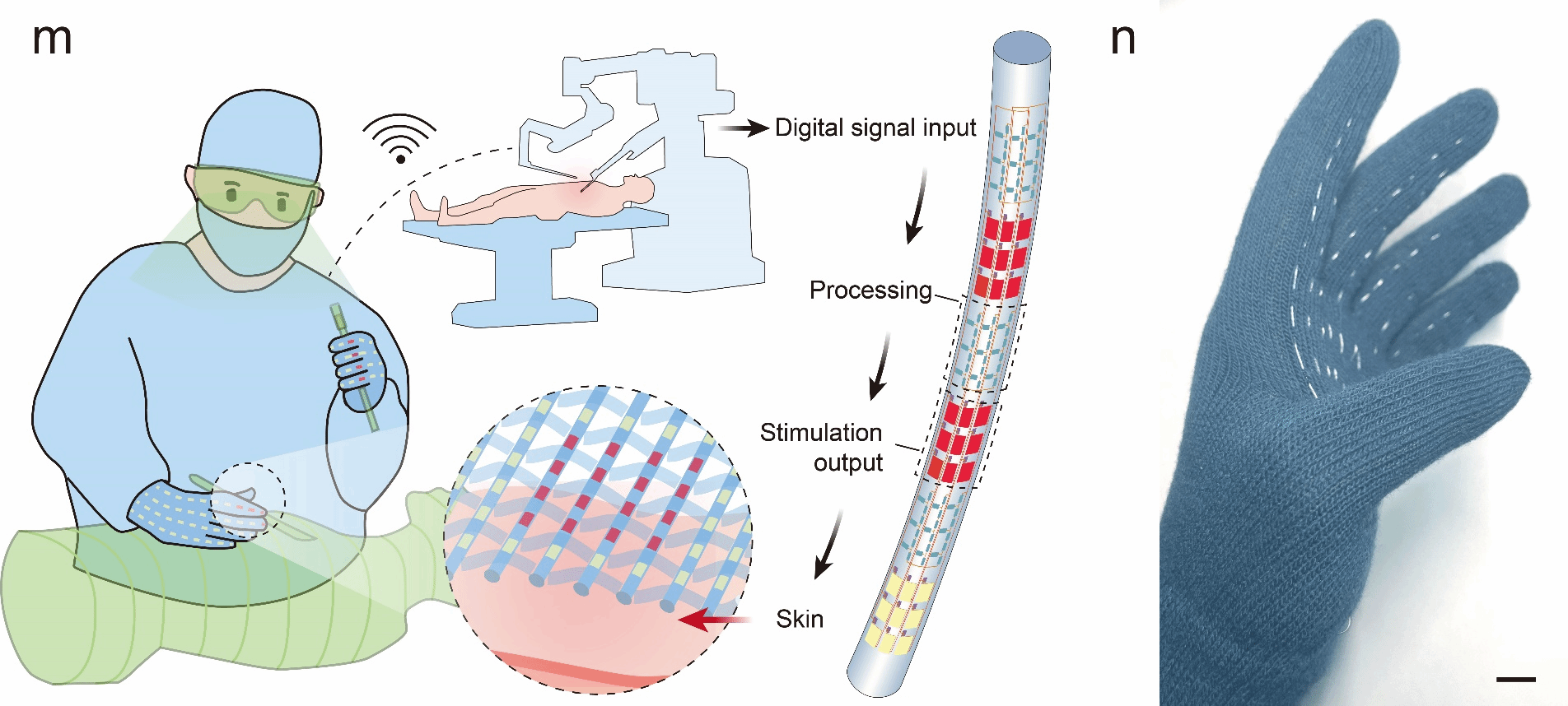 在虚拟现实领域,目前触觉接口高度依赖块状硬质信号处理模块,导致与皮肤柔性表面贴合度不足,难以实现精准细致的信号采集与输出,在远程医疗机器人手术等精细操作场景中局限性尤为突出。基于“纤维芯片”所构建的智能触觉手套,兼具高柔性与透气性,可集成高密度传感与刺激阵列,精准模拟不同物体的力学触感,适用于远程手术组织硬度感知、虚拟道具交互等场景,提升用户与虚拟环境的交互体验。
