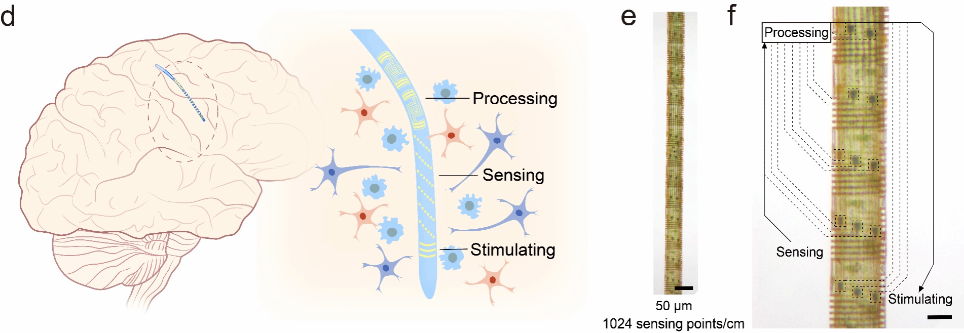 在脑机接口领域,传统脑机接口的电极普遍需要连接硬质的外部信号处理模块,才能实现有效的信号处理与识别。基于“纤维芯片”技术,有望在一纤维内,集成“传感-信号处理-刺激输出”闭环功能系统。团队初步验证,在直径低至50微米的超细纤维上,可同时集成高密度传感-刺激电极阵列(1024通道/厘米)与信号预处理电路(前置放大单元),具有与脑组织相当的柔性和良好生物安全性,其所采集的神经信号信噪比,与商用外部信号预处理设备相当。该纤维系统有望为脑科学和脑神经疾病诊断与治疗提供新的工具。