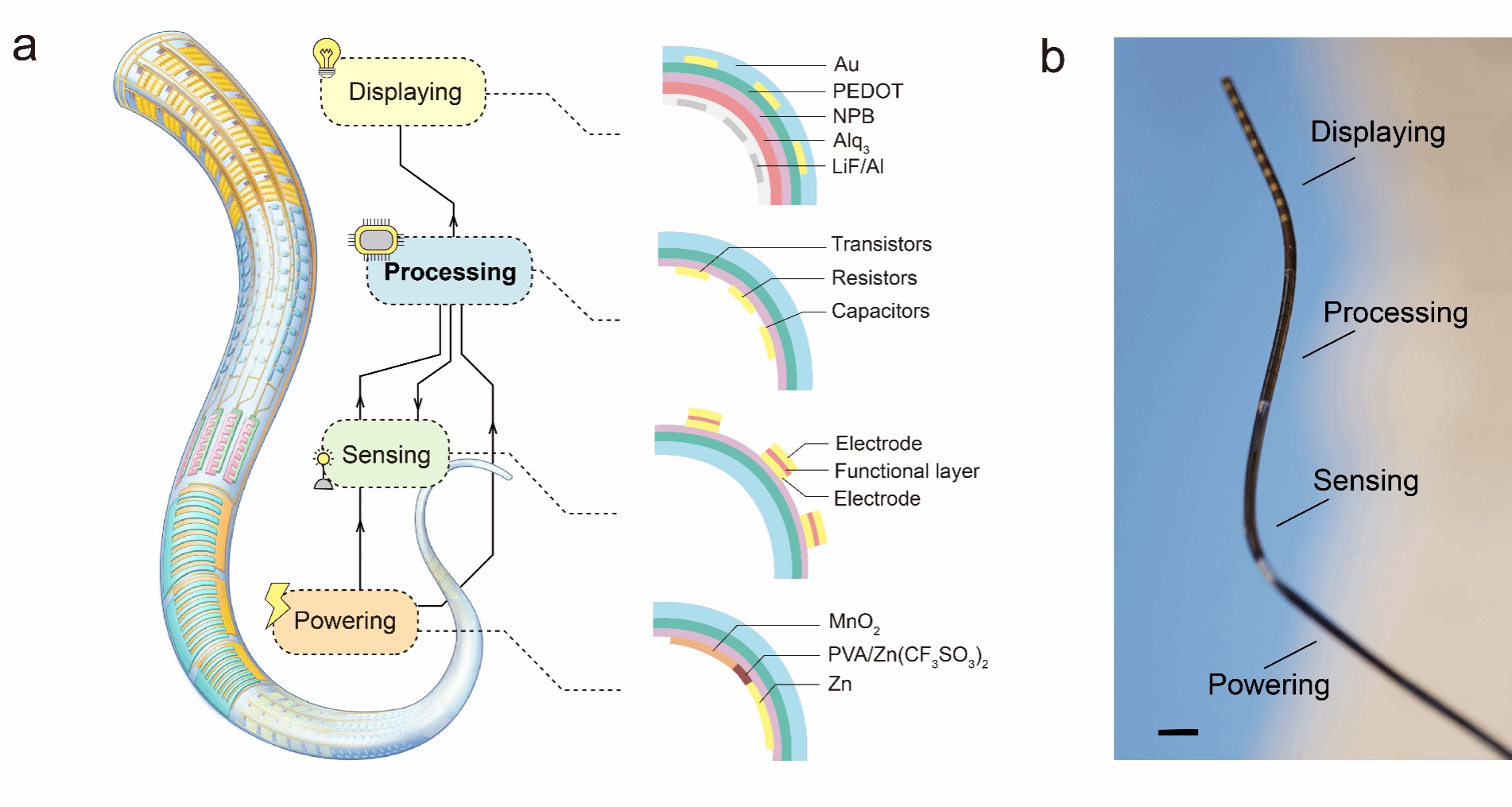 过去几十年,纤维器件相继被赋予发电、储能、显示、感知等功能,它们可以被编织成柔软、透气的智能终端,有望实现“以人为中心”的全新人机交互范式,推动信息、能源、医疗等重要领域革命性发展,甚至催生电子织物等新产业,深刻改变人们生活方式。像手机、电脑等任何电子设备一样,具有信息处理功能的芯片,是纤维器件走向纤维系统,并实现信息交互功能的核心部件。但长期以来,纤维系统一直依赖连接硬质块状芯片,这与其柔软、可适应复杂变形等应用要求存在根本矛盾,成为整个领域面临的一个重要挑战。