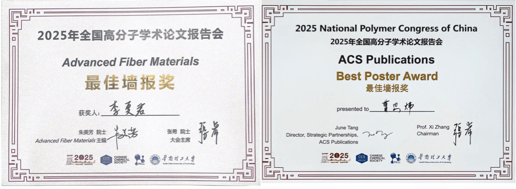 本次大会上,孙雪梅教授、王兵杰研究员、张松林青年研究员、廖萌助理教授、朱正峰助理研究员带队参会并作邀请报告与口头报告,分别介绍了我院在柔性纤维生物传感材料与器件、可穿戴电子织物的工程化、柔性高分子复合传感材料、纤维聚合物储能电池、纤维太阳能电池等方向的最新科研进展,除教师受邀报告外,我院另有5名学生参会,其中2021级博士生李雯君和2023级博士生曹思炜荣获“最佳墙报奖”,展现我院在纤维电子材料与器件领域的研究特色与优势。